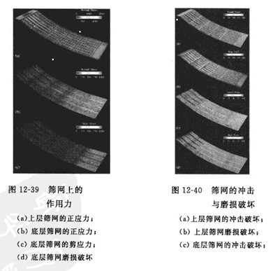 振動篩篩分的DEM仿真結(jié)果可以用于分析顆粒群再篩網(wǎng)上的松散度、振動強(qiáng)度、料層厚度、篩孔孔徑和篩面傾角等參數(shù)對分離粒度及篩分效率的影響及相互作用。顆粒群再篩網(wǎng)上的流動平衡、顆粒對篩網(wǎng)的沖擊速度計施加在篩網(wǎng)上的載荷也能通過DEM仿真結(jié)果獲得,從而確定篩網(wǎng)所受的應(yīng)力、篩網(wǎng)的磨損及篩分裝置的功率、圖12-39和圖12-40分別為Yuan等人通過DEM仿真獲得的篩網(wǎng)上的作用力圖和篩網(wǎng)的沖擊與磨損破壞圖。